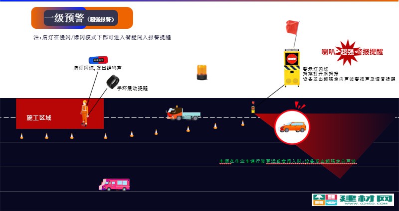 3.一级预警模式:当车辆在作业车道上快速行驶进入摇旗声光预警器检测范围内或更近闯入时:设备在摇旗动态预警、红蓝闪灯的同时发出超强定向声波(报警声及语音播报提示)的同时智能肩灯发出蜂鸣声/手环震动提醒佩戴人员。